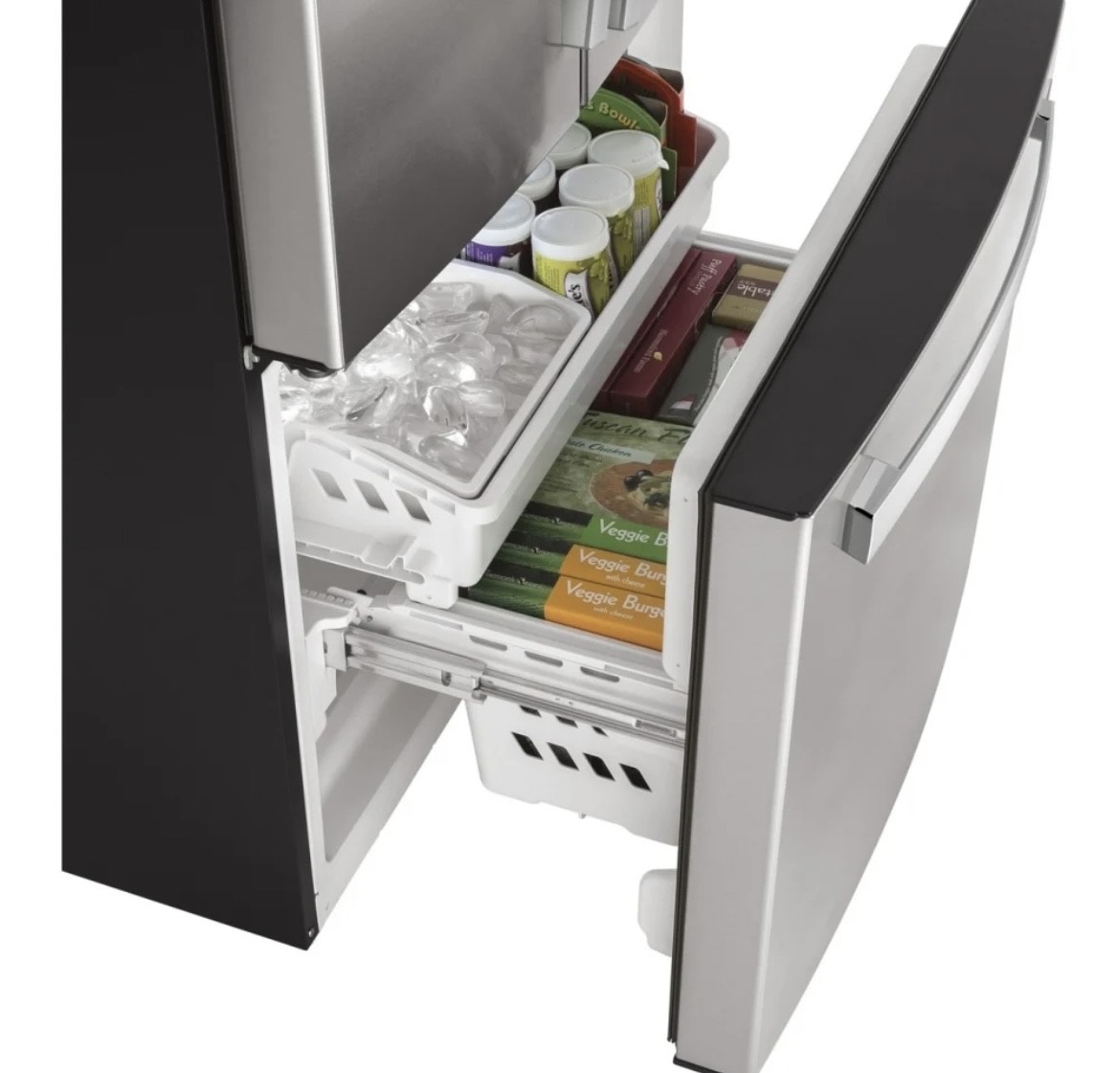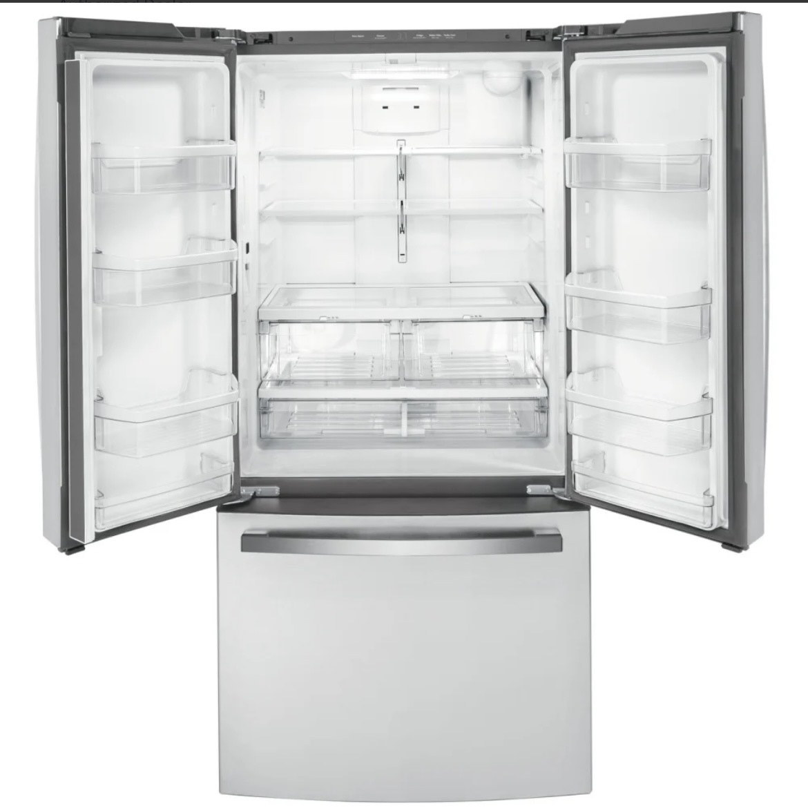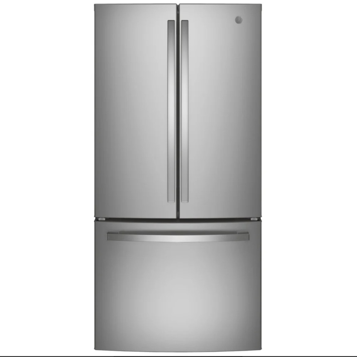 Specification Value Capacity 18.6 Cu Ft Fresh Food Capacity 13.6 Cu Ft Freezer Capacity 5.0–5.02 Cu Ft Width 32.75–33.00 inches Height (Overall) 69.81–69.88 inches Height to Top of Case 68.63 inches Height to Top of Hinge 69.75 inches Height to Top of Door 69.88 inches Depth (Overall) 30.19–31 inches Depth Without Handles 28.94–29 inches Case Depth Without Door 24.13 inches Depth with Door Open 90° 42–42.13 inches Width with Door Open 90° (Including Handle) 40.5 inches Counter-Depth Design Yes Configuration French Door, Bottom Freezer Installation Type Freestanding, Counter-Depth Energy Star Certified Yes Energy Consumption 547 kWh/year Electrical Requirements 120 V / 60 Hz / 15 A Refrigerant Type R600a Finish / Color Fingerprint Resistant Stainless Steel Case Color Gray or White (varies by listing) Door Color Stainless Steel Handle Color Stainless Steel Appearance Handle Design Designer Style / GE Standard Exterior Design Contoured Crown Doors Door Swing French Door (2 doors fresh food, 1 freezer drawer) Number of Doors 3 Interior Lighting (Fresh Food) Dual-Level LED Interior Lighting (Freezer) LED Temperature Management Multiflow Air System with Electronic Sensors Controls Upfront Electronic Temperature Controls with Digital Temperature Display Temperature Display Internal Digital, Actual-Temperature Display Turbo Cool Yes Turbo Freeze Yes Defrost Type Frost Guard / Frost Free Fresh Food Shelves (Total) 5 Glass Shelves Fresh Food Shelves (Adjustable) 4 Split Adjustable Glass Shelves Quick-Space Shelf 1 Quick-Space Shelf Fresh Food Drawers 2 Humidity-Controlled Crispers + 1 Full-Width Adjustable Temperature Deli Drawer Fresh Food Door Bins (Total) 8 Clear Door Bins Fresh Food Door Bins (Fixed) 2 Fixed Bins Fresh Food Door Bins (Adjustable) 6 Adjustable Bins with Gallon Storage Gallon Door Storage Yes Freezer Storage Baskets 2 Storage Baskets (2 Total; 1 Full-Width, Full-Extension Plastic) Freezer Shelves 1 Full-Width Wire Shelf (varies by listing) Freezer Configuration Pull-Out Drawer Ice Maker Factory-Installed Ice Maker Ice Bucket Included Water Dispenser Internal Water Dispenser Water Filtration GE Advanced Water Filtration (XWFE Filter) Water Filter Indicator Light Yes Door Alarm Yes Spill-Proof Shelves Yes Levelling System 2 Adjustable Front Rollers / 2-Point Front Adjustable Cabinet Liner ABS Door Liner HIPS WiFi Connected No (Optional WiFi Connect with separate part PBX23W00Y1) Sabbath Mode Optional (OU/CRC Enhanced Shabbos Mode with Shabbos Keeper, sold separately) Product Type Bottom Freezer, French-Door, Counter-Depth Refrigerator UPC 0084691853831 Net Weight 232 lbs Approximate Shipping Weight 252 lbs Back Air Clearance 2 inches Top Air Clearance 1 inch Side Air Clearance 0.125 inches
